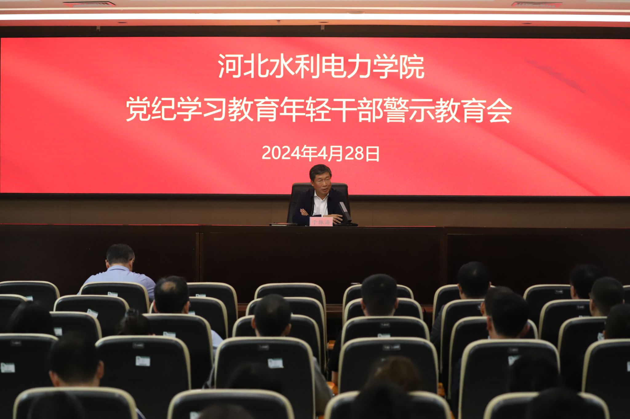 为深入推进党纪学习教育,提升教育成果,教育引导年轻干部学纪、知纪、明纪、守纪,按照省纪委监委关于开展警示教育的通知要求和学校党委工作部署,4月28日,我校召开年轻干部警示教育会。副校长于振海出席会议并讲话,纪委副书记李昕欣主持会议。副校长杨凯、全校年轻干部及新提拔干部110余人参加会议。与会人员集中观看了警示教育片,警示教育片是由省纪委监委选取近年来查处的多起年轻干部违纪违法典型案例,通过违纪违法干部忏悔独白、...