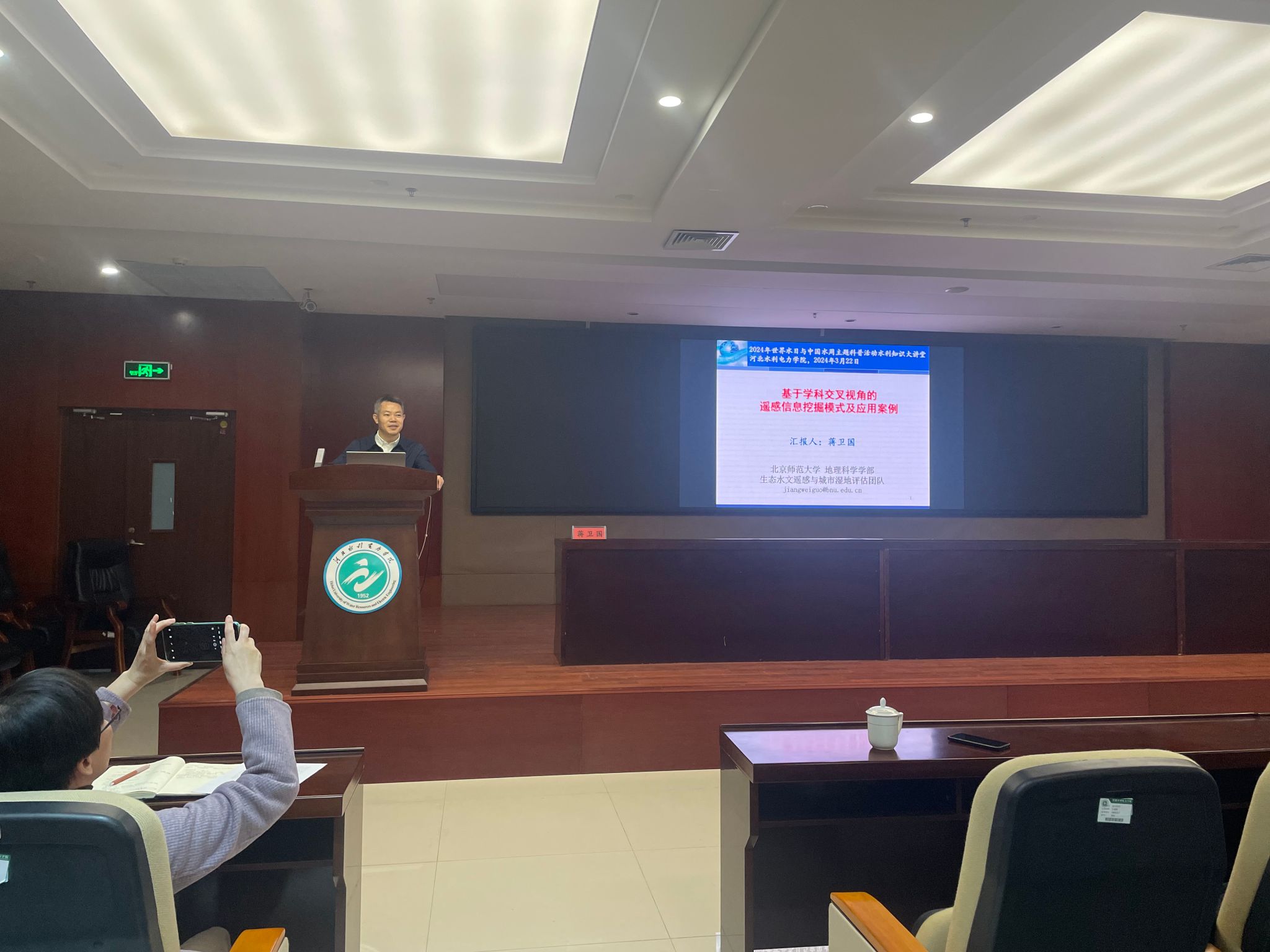 北京师范大学地理科学学部教授蒋卫国以“基于学科交叉视角的湿地遥感信息挖掘模式及应用案例”为主题,将近几年遥感技术领域国内外发展现状进行了深入的讲解,并从遥感技术应用与挑战、遥感地学分析模式与产品和学科交叉视角的遥感挖掘应用案例三部分内容进行报告,结尾蒋教授针对于遥感技术在水利电力等专业领域的前景进行了肯定,并鼓励学生大胆探索,积极创新!
