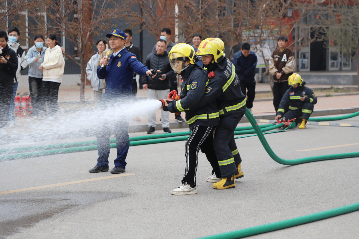 最后,赵江奎为大家讲解了室内消火栓的使用方法,消防员们手把手教师生员工使用消防车高压水枪灭火,让师生员工当了一回“消防员”。