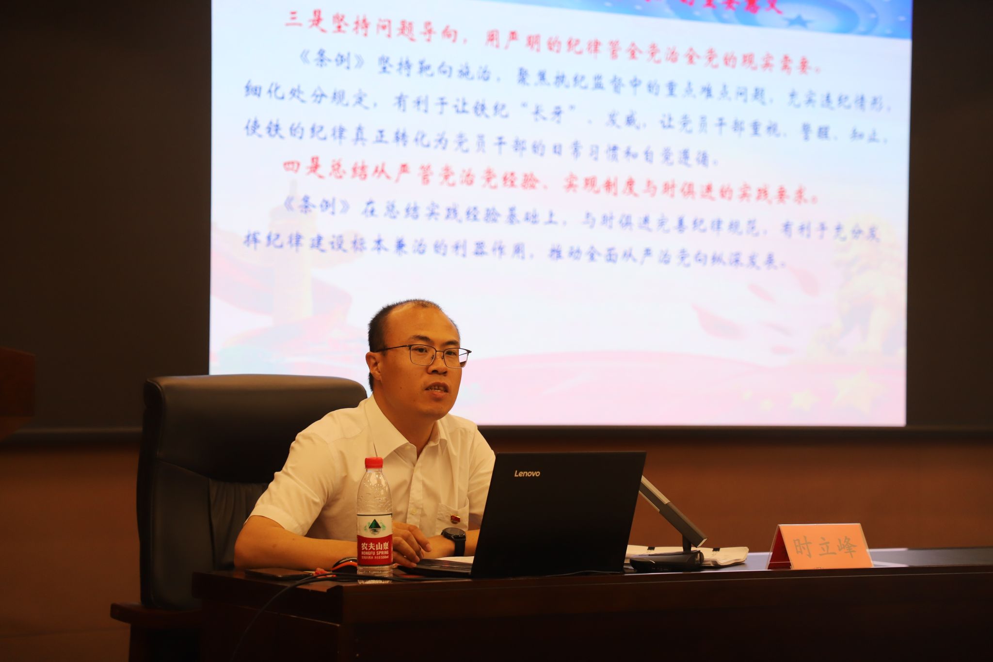 开班式后,沧州市纪委监委案件审理室时立峰副主任进行了《中国共产党纪律处分条例》的专题辅导。他从深刻认识修订《条例》的历史意义、为什们要学习和遵守《条例》、中央八项规定精神问题及新的表现形式、《条例》的主要内容和贯彻执行《条例》的几点认识等五个方面,详细分析讲解了《中国共产党纪律处分条例》的修订历程、重要意义以及2023版修订的主要内容。