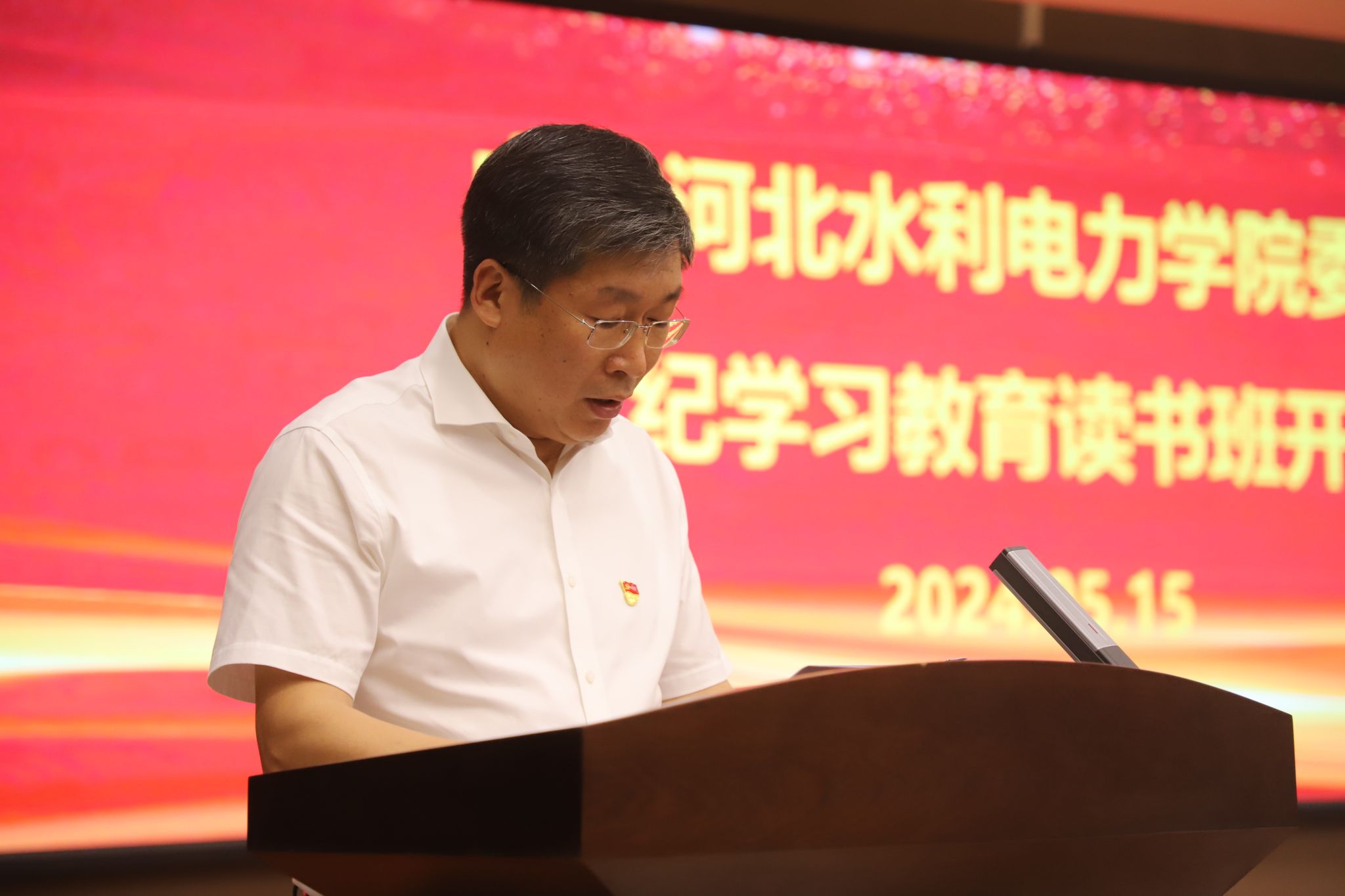 5月15日,我校处级以上领导干部党纪学习教育读书班在弘文守正楼报告厅开班,党委书记张效松出席开班式并讲话,校领导班子成员出席,副校长于振海主持开班式。