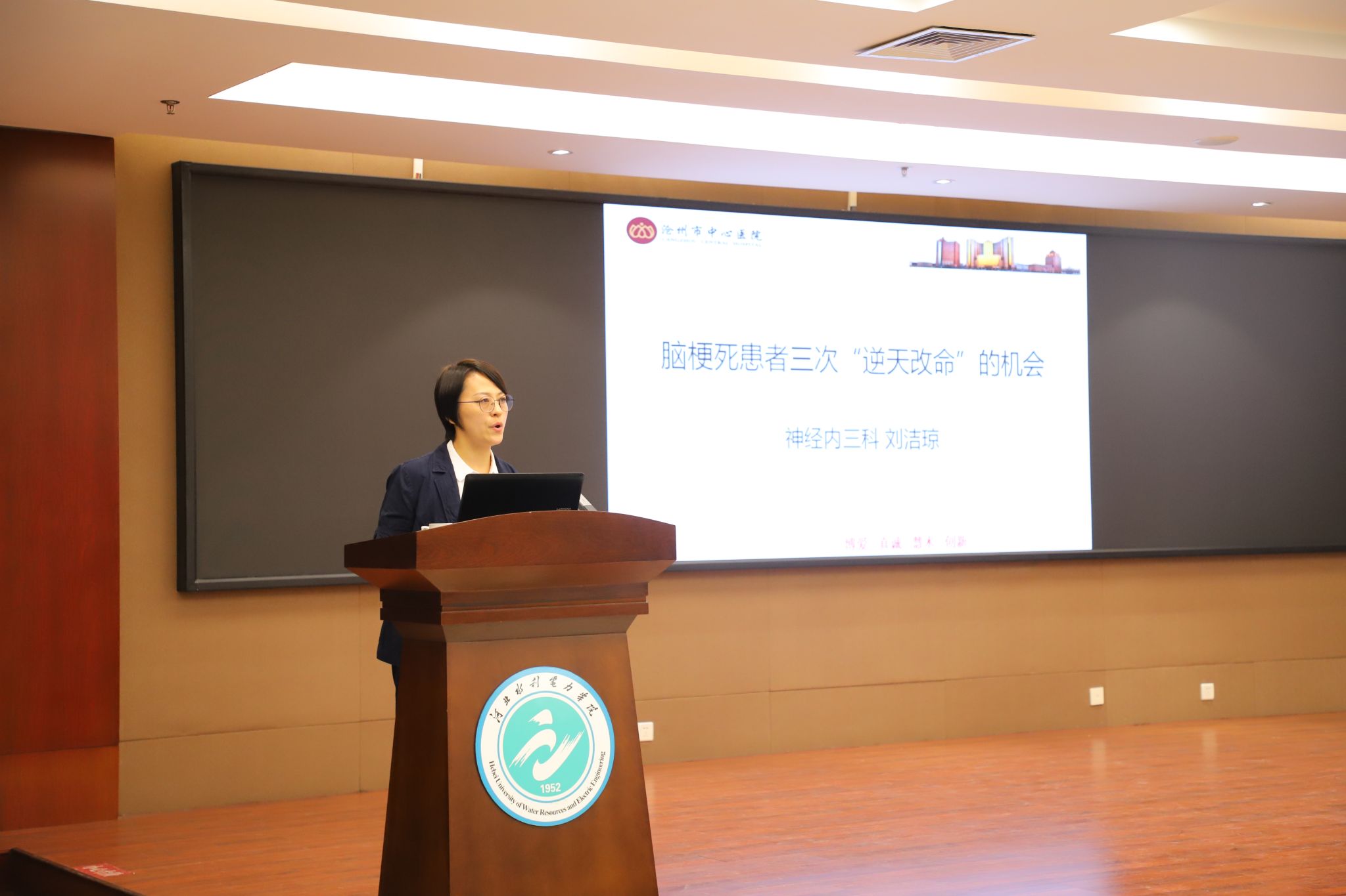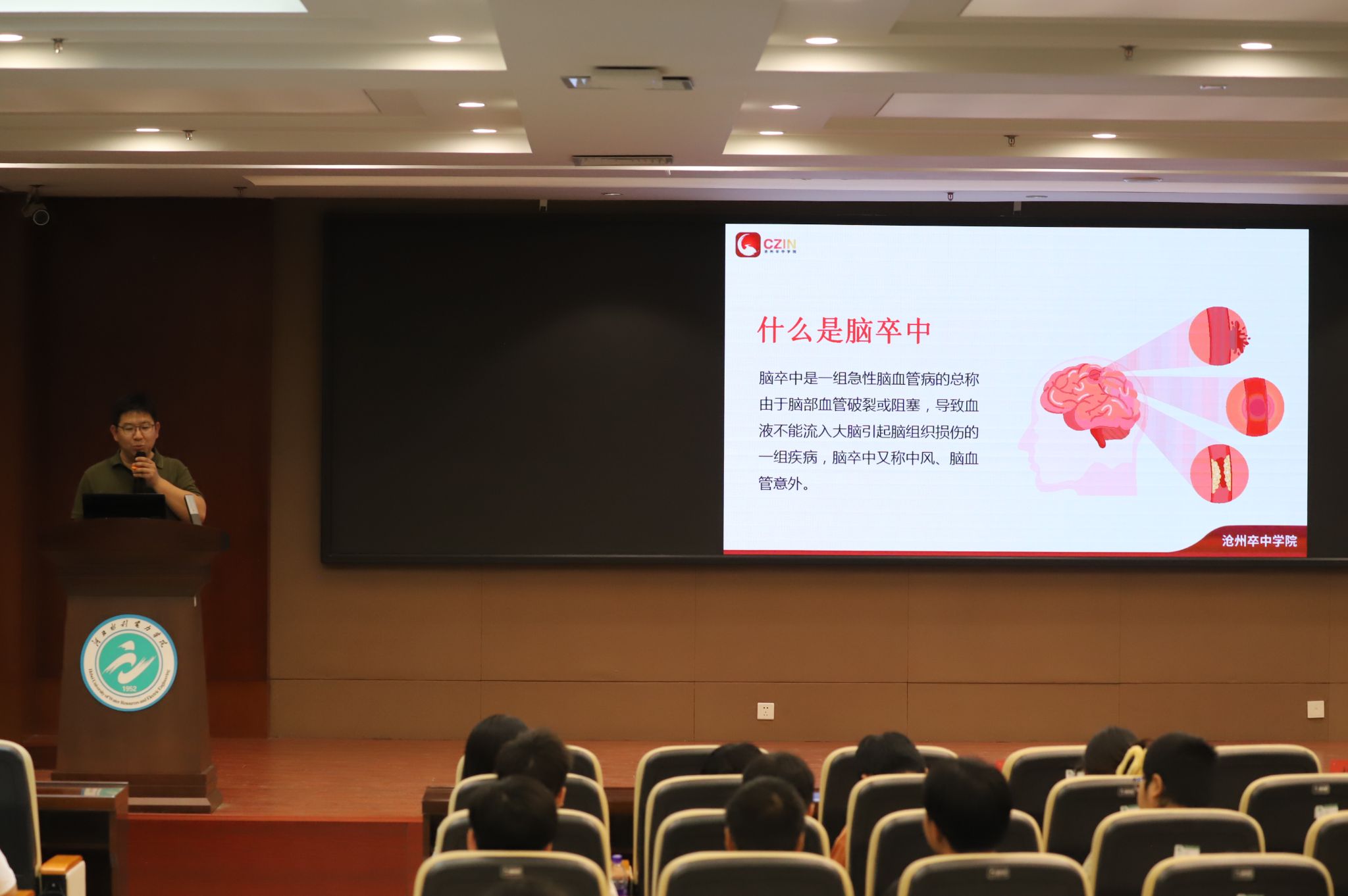 6月13日,“健康中国 中风识别”行动——沧州市中心医院狮城青年医师卒中宣讲团第一讲在我校举行。党委书记张效松、副校长杨凯,沧州市中心医院党委书记高广明、副院长程才出席宣讲活动,校工会常务副主席周保国、团委书记路维、沧州市中心医院相关职能科室主任及宣讲团成员也参加了此次活动。宣讲由狮城青年医师卒中宣讲团团长李书林主持。