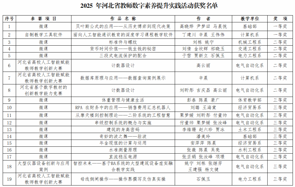 近日,河北省教育厅公布了“2025年河北省教师数字素养提升实践活动”评选结果,我校共19项作品获奖,其中一等奖2项,二等奖6项,三等奖11项,获奖质量与数量较往年均有显著提升。