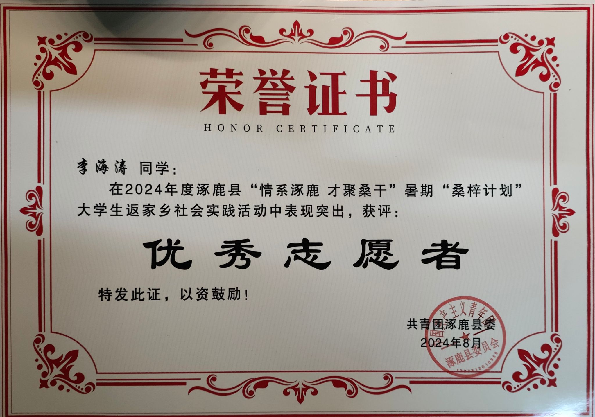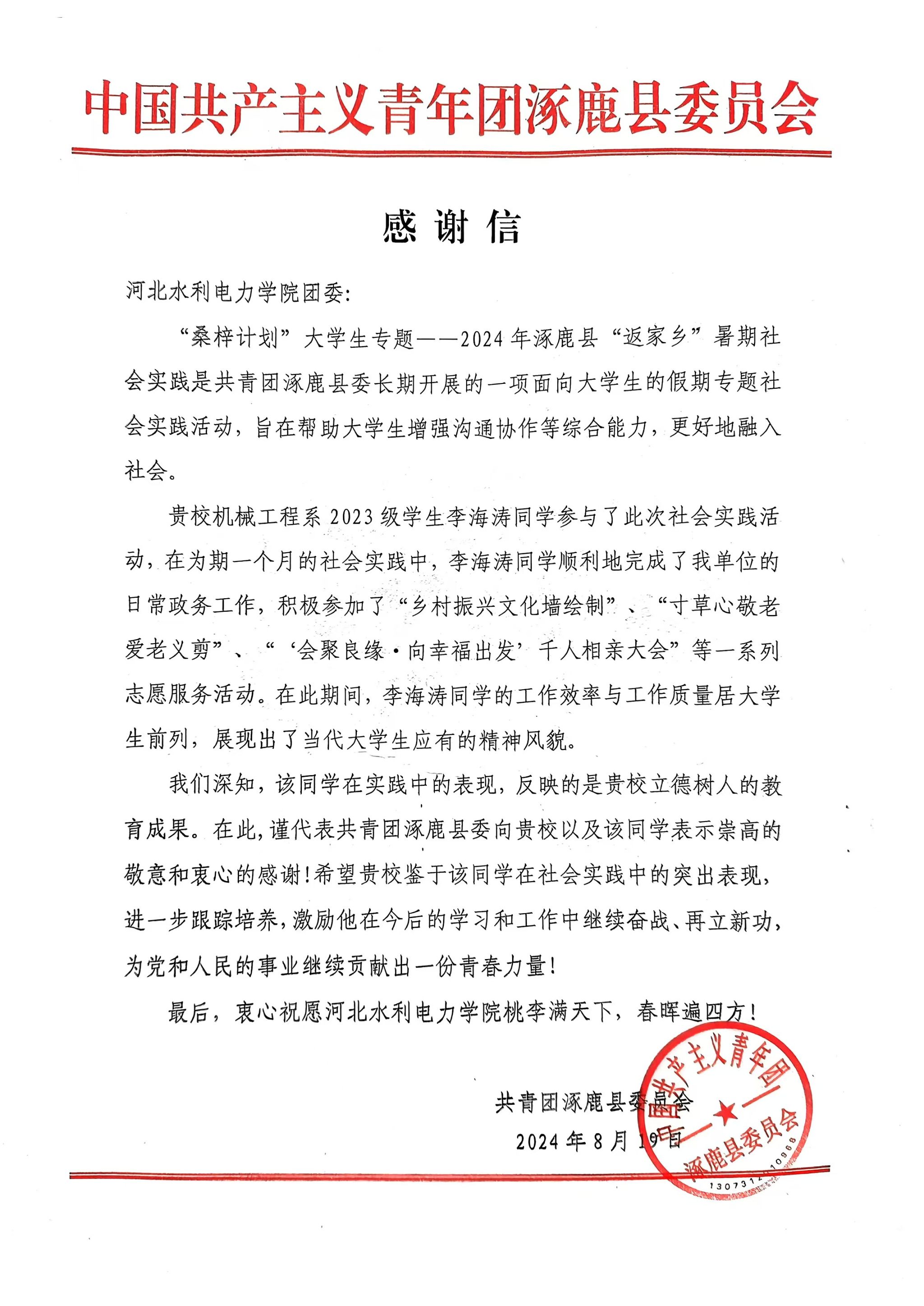 近日,社会实践工作传来喜讯,机械工程系学生李海涛在今年暑期社会实践活动中表现突出,荣获张家口涿鹿县共青团委的高度评价与表彰,被授予“优秀志愿者”荣誉称号,并收到涿鹿县共青团委的感谢信。